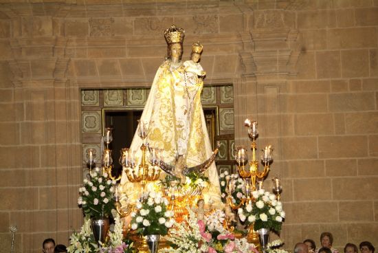 La procesión de la Virgen del Rosario, patrona de Alhama, recorre las calles con acompañamiento de bandas de música y cohetes.
